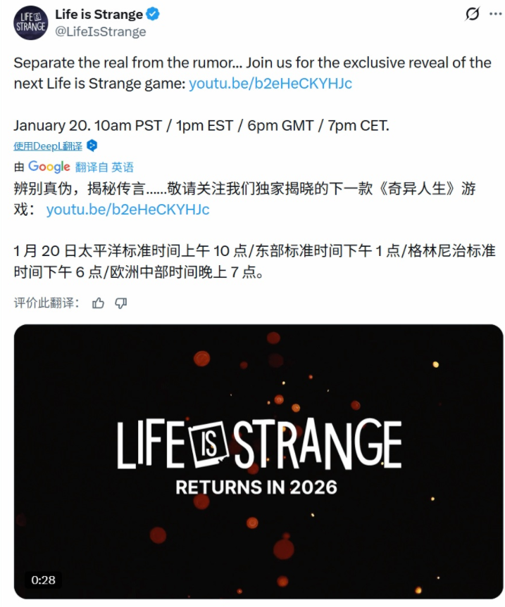 99游戏网讯 www.my99.com 2026年1月,当《奇异人生:重聚》的评级信息提前曝光,官方随后确认这款新作将回归初代角色线,围绕克洛伊与麦克斯的故事展开时,玩家社群的反应呈现出复杂的撕裂状态。一方面,初代《奇异人生》积累的深厚情感基础让无数玩家对这对经典搭档的回归充满期待;另一方面,系列后续作品的口碑波动,以及"双重曝光"对情怀的试探性消费,让部分玩家对这次"直接回归"产生了警惕。当官方宣布将于1月21日凌晨2点公布更多详情时,围绕"是否愿意为麦克斯与克洛伊的故事再度买单"的讨论,已经超越了单纯的情怀期待,触及了叙事游戏系列化发展的核心命题:在情怀与创新之间,如何找到可持续的平衡点?