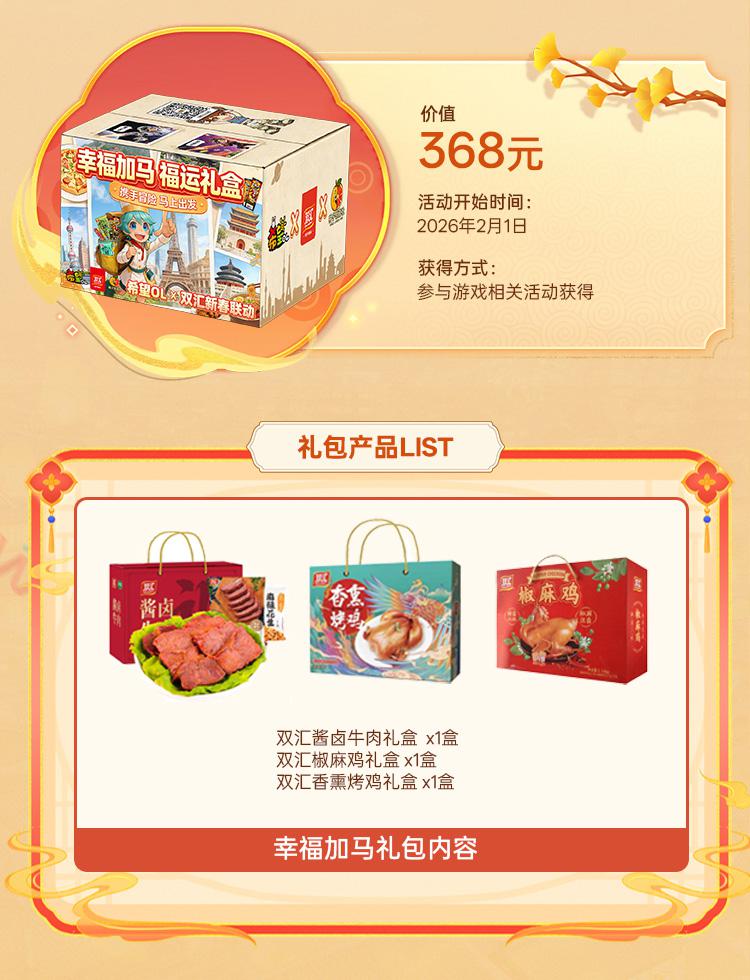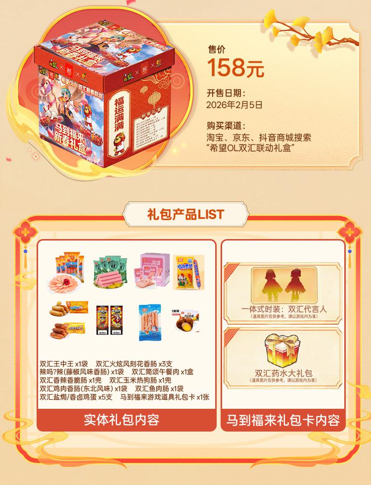 我们与双汇精心打造了多种联名主题新春礼盒,礼盒设计深度融合《希望OL》的奇幻色彩与双汇的品牌元素,其中“马踏钱程纳福礼盒”和“马到福来新春礼盒”会在2月5日起上架双汇京东、淘宝、抖音等平台商城,冒险者可以直接进入商城选购。这两款礼盒不仅包含精选的双汇人气美食,更将分别附赠珍贵的限定联动称号和专属一体式时装兑换码,让你在享受实体美味的同时,也能在游戏中解锁独家惊喜。